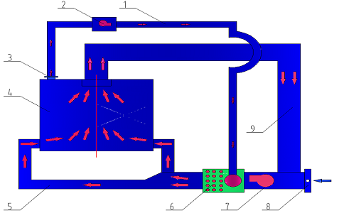 高壓電柜噴粉烘干固化自動生產線隔離室 1.設計原理 為了減少噴粉車間不受到外界的污染、工件在生產線上的再次污染、提高成品率,在噴粉車間外設計一隔離室,防止車間內灰塵的再次污染,補風采用頂部經初效過濾自然進風。