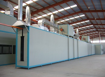在工作時,通過新風機組內的換熱裝置對循環風進行加熱。烘干設計溫度0~80±5℃,加熱能源天燃氣,熱風從頂部送入,下部回風。以保證烘干室各段風量、溫度均勻。工件烘干過程中,工件漆膜內殘存的有機溶劑不斷揮發出來,為了使烘干室內的氣體中有機溶劑的含量低于爆炸濃度的下限,烘干室保持安全運行,循環熱風中要補充一定的新鮮空氣,同時要排出一定量的高濃度的廢氣。烘干室內裝有溫度傳感器,以顯示各點溫度,并設有自動調溫裝置,使溫度波動控制在±5℃以內。 | 天然氣加熱烤漆烘干房在工作時,新風空氣通過燃燒器加熱后,在循環風機作用下經過過濾器,進入烘干室底部的送風管道,熱風從出風口出排出進入烘干室內,對工件表面漆膜進行烘干,利用熱空氣上升原理,在頂部設置回風管路再進入循環風機組,使熱風能循環使用。 |